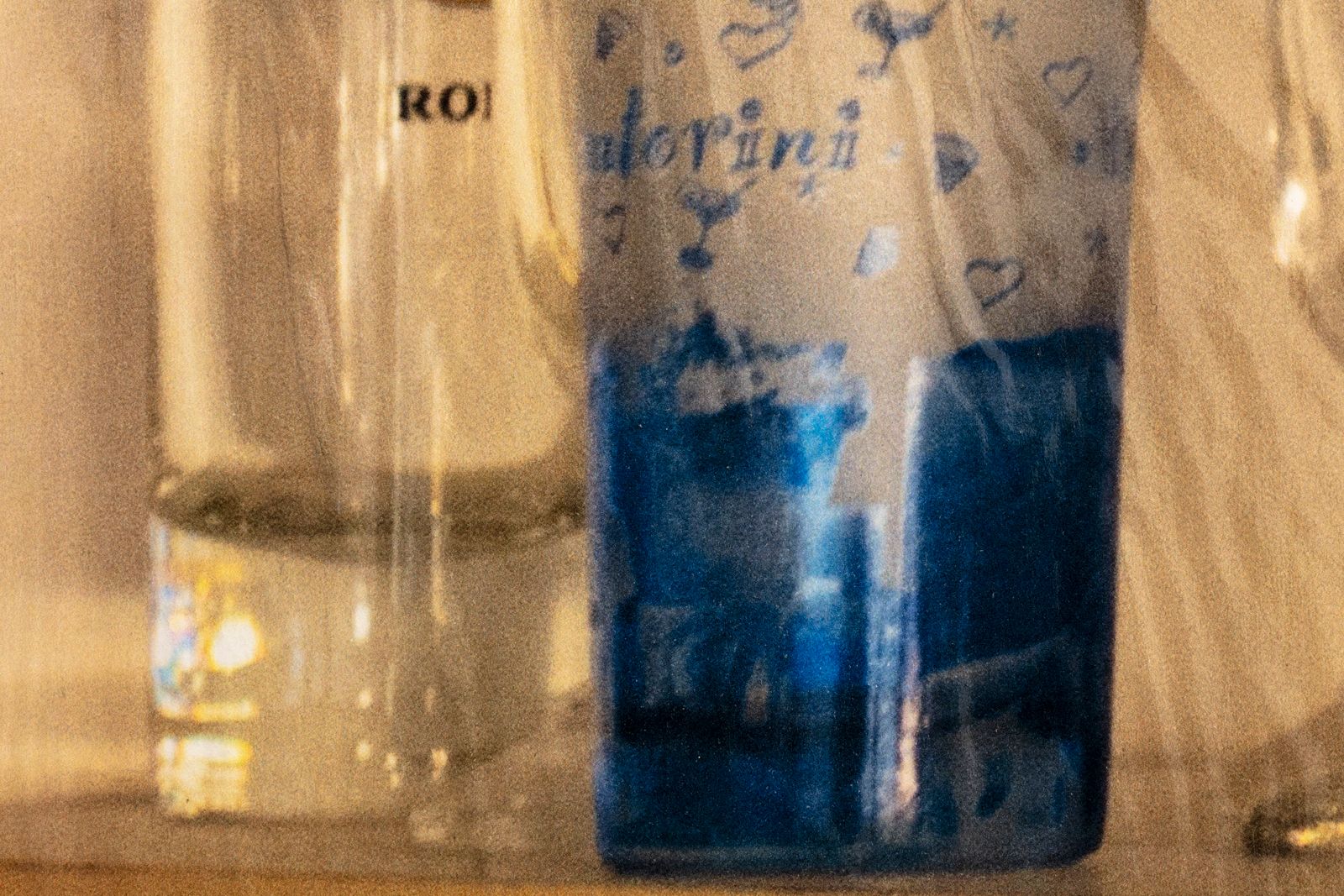 Półka szklanki, 2023, digital print mounted on HDF board, varnish, wooden strips, glue and staples, 69 × 46 cm