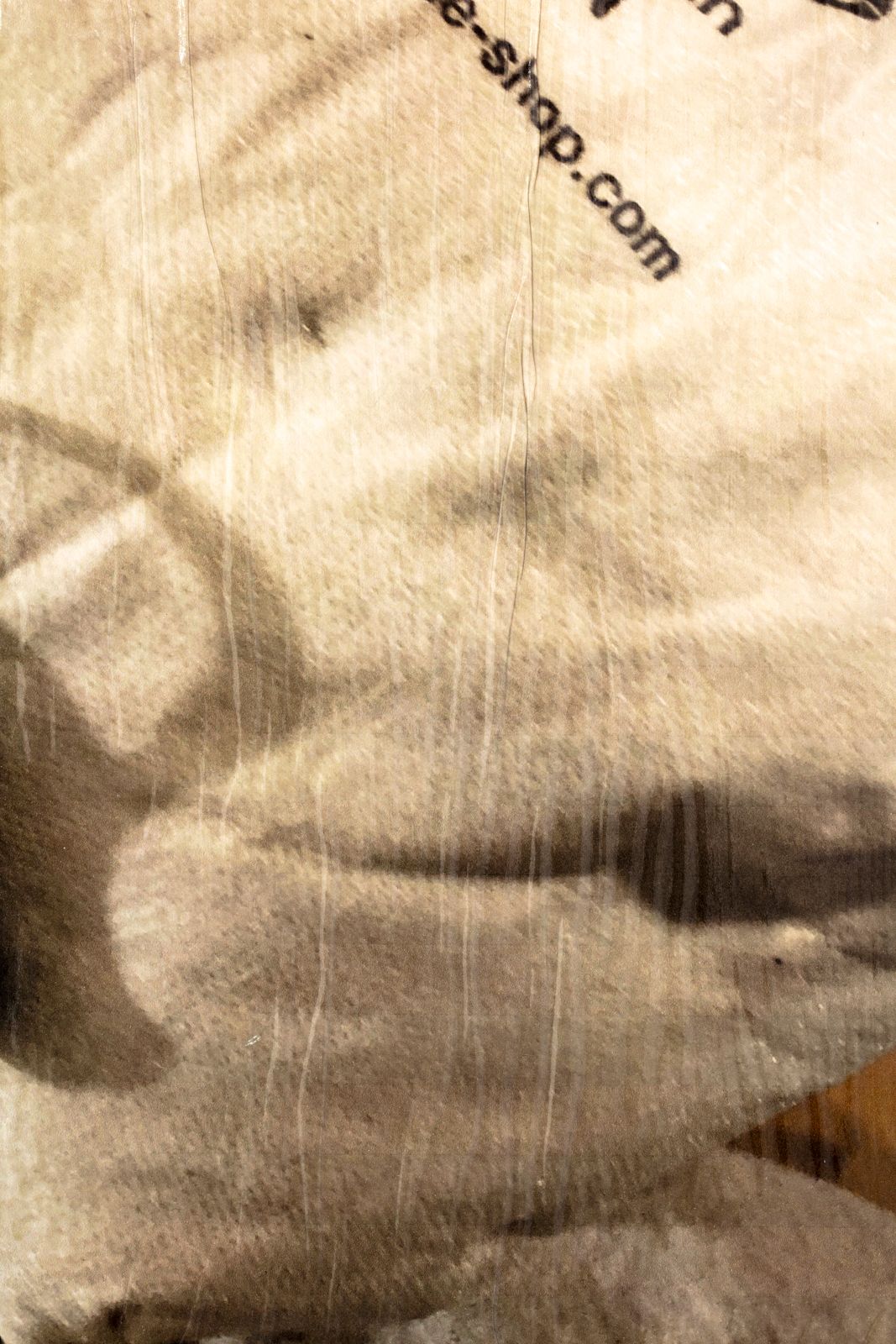 Worek, 2023, digital print mounted on HDF board, varnish, wooden strips, glue and staples, 53 × 42 cm